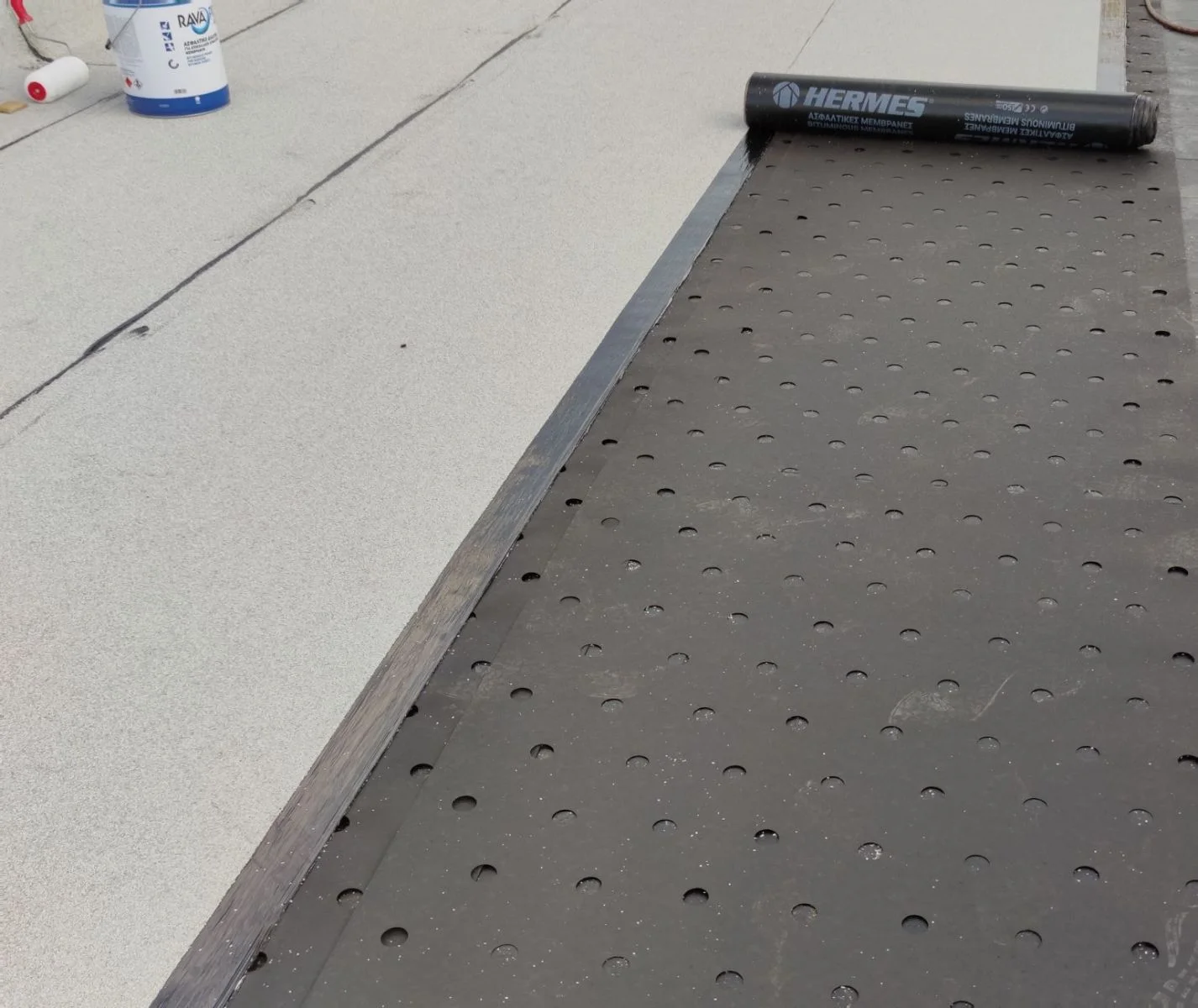 In order to achieve this semi-independence, the perforated ventilation membrane is laid as the 1st layer where it has holes in its surface. After that we apply the tar paper as a 2nd layer by using a flame cutter over as much surface area as the holes of the first layer allow.